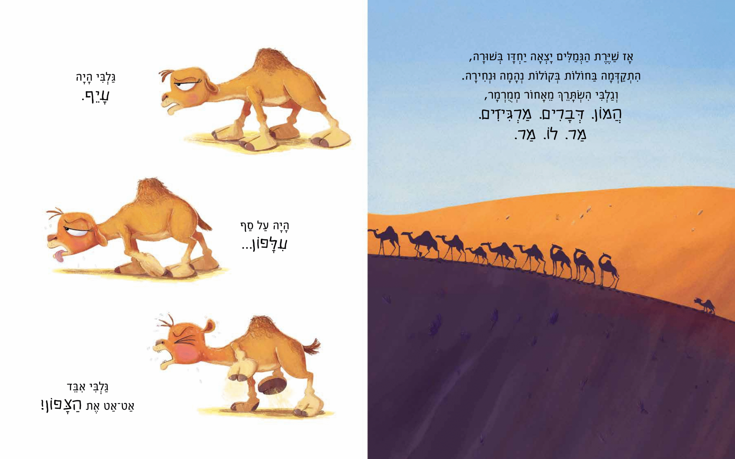 רייצ'ל ברייטאיורים: ג'ים פילד תרגמה וחרזה: ניצה פלדלגילאי 6-3שנת הוצאה: 2026לרכישה: גרסה רגילה גרסת קרטון דיגיטלי The Camel Who Had The Hump רייצ'ל ברייטאיורים: ג'ים פילד תרגמה וחרזה: ניצה פלדלגילאי 6-3שנת הוצאה: 2026לרכישה: גרסה רגילה גרסת קרטון דיגיטלי The Camel Who Had The Hump רייצ'ל ברייטאיורים: ג'ים פילד תרגמה וחרזה: ניצה פלדלגילאי 6-3שנת הוצאה: 2026לרכישה: גרסה רגילה גרסת קרטון דיגיטלי The Camel Who Had The Hump הרפתקה חדשה, מלהיבה ומחורזת מאת הסופרת רייצ'ל ברייט והמאייר ג'ים פילד, היוצרים של ספרי הילדים האהובים האריה שבפנים, קווין הקואלה תקוע למעלה ועוד.אור השחר עולה על פני החולות, וגמל אחד קטן מתעורר עצבני!חם לו, הוא עייף, ואין לו שום כוונה לצעוד היום!האם מישהו יצליח לשנות את דעתו? אולי היצור הכי קופצני ומאושר במדבר יוכיח לו שדי בחיוך כדי להציל את המצב…לפעמים בחירה בשמחה יכולה להפוך התחלה מתסכלת לסוף טוב. מגיל 3 ומעלה. מתוך הספר: ספרים נוספים מאת רייצ'ל ברייט